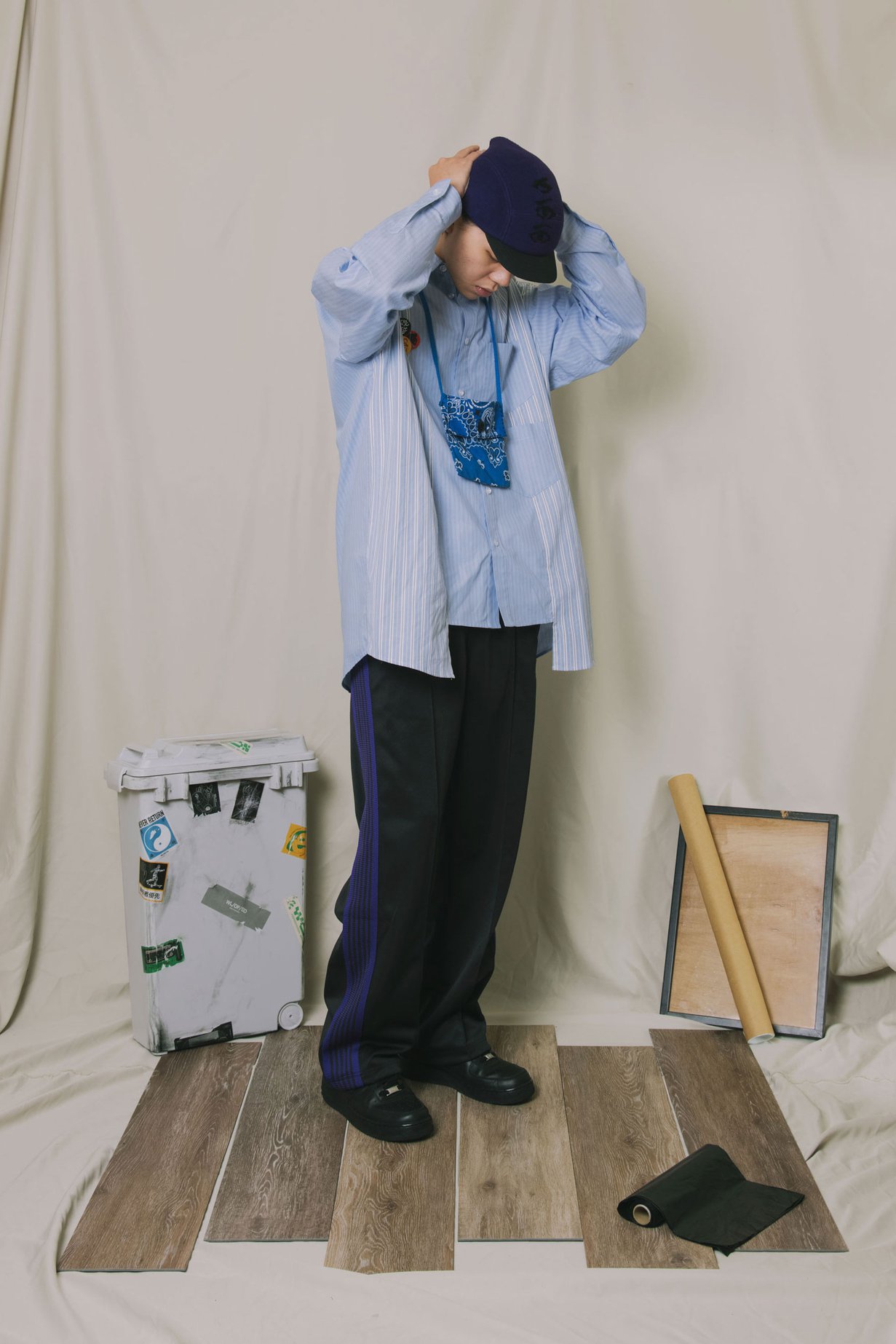 “69”系列好評販售的寬鬆長袖襯衫單品,新設定拼色推出,以陰陽交融意象發想,將兩種異色面料組合,於襯衫前片兩側製作拼接細節,結合寬鬆、極闊身的剪裁版型,打造特殊的穿著視覺感。單品選用純棉襯衫布料製作,全件包縫製作,隨襯衫附上三只圖像別針,襯衫分別以紅格紋、條紋兩色推出。