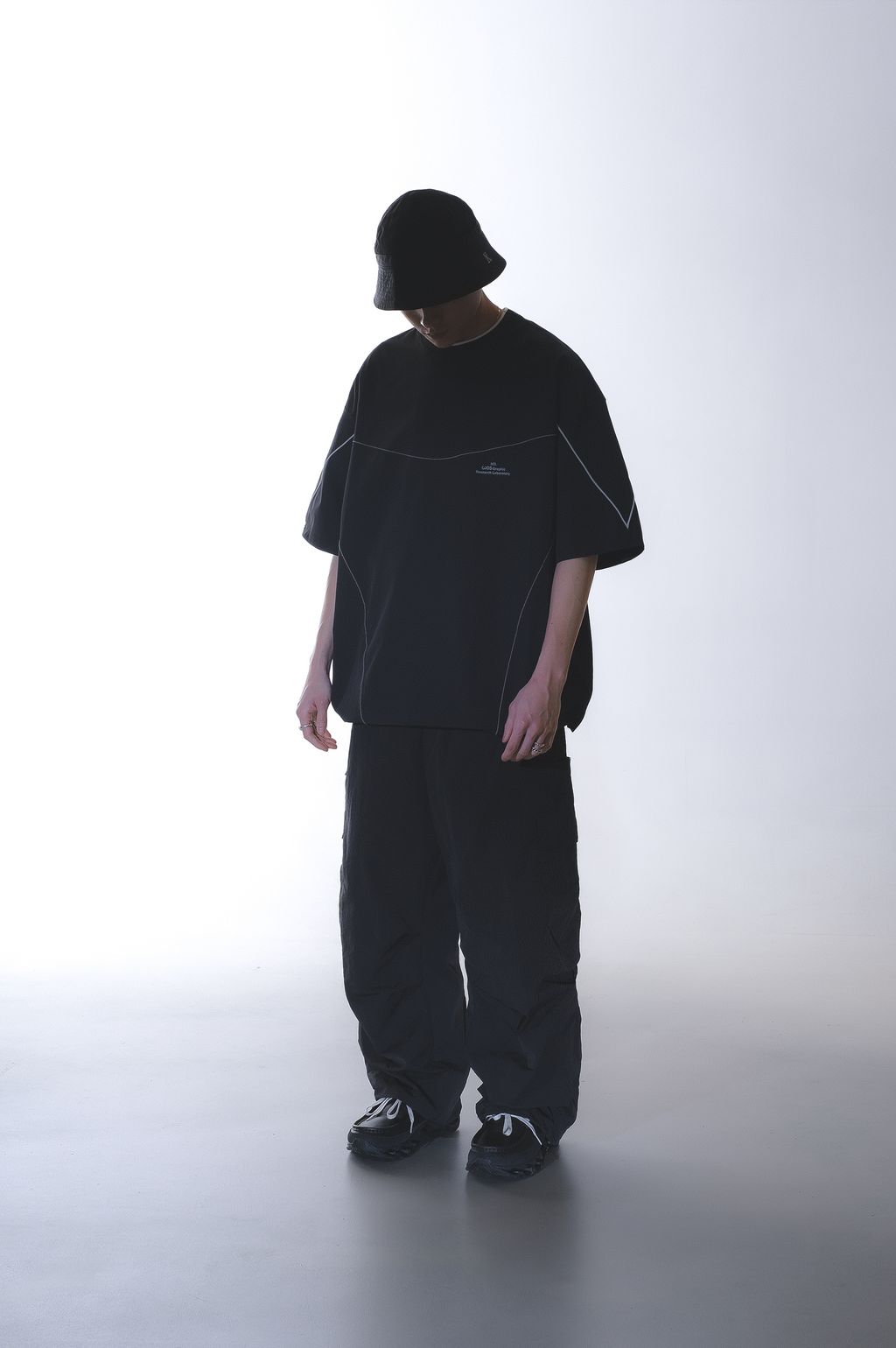 使用寬大、落肩設定的 OVERSIZE 剪裁版型製作,配合下擺配置抽繩系統,可依穿著需求調整下擺抽繩鬆份,則可變化不同穿著輪廓,選用親膚、輕薄快乾的尼龍混紡面料,面對炎熱的氣候穿著也相當舒適。